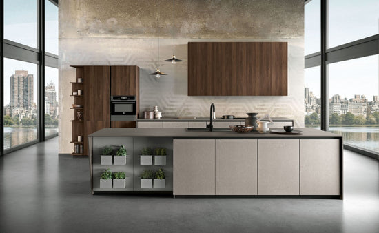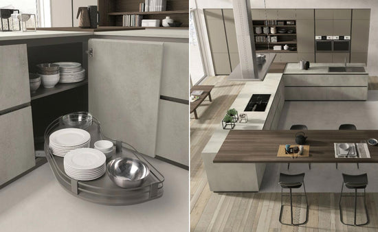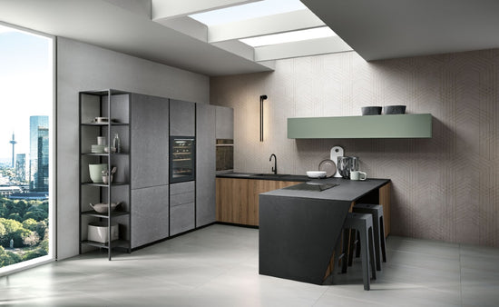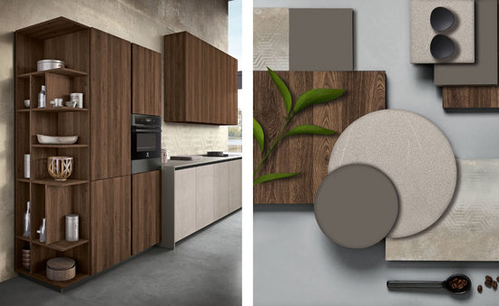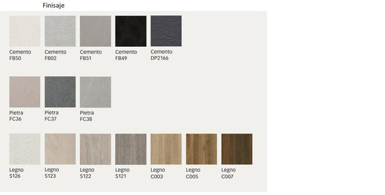 Șapte finisaje din lemn, efect de piatră în trei culori și alte trei efecte de ciment: unele dintre ele sunt disponibile și cu ușa tăiată la 30°. Este un proiect compus din culori si finisaje perfect asortate pentru solutii infinite de design de bucatarie si living.