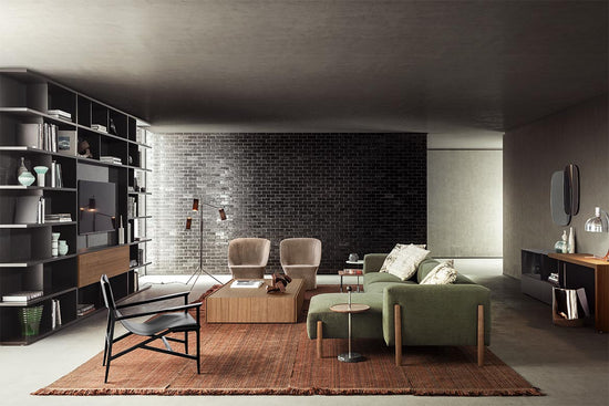 O provocare pentru gravitație. All-in concentrează totul pe alegeri îndrăznețe de design. Forme și volume generoase dialog pătrat cu o esențialitate compozițională plină de lejeritate și calm. Pentru a susține o suspensie de 18 cm de la sol există picioare înalte. Ele aleargă de-a lungul părților laterale cu finisaje la alegere dintre cele din colecție. Ascunsă vederii, structura este în întregime cuprinse în pernă. Spătarul este disponibil într-o variantă dublă, la același nivel cu cotierele sau mai mare, soluții care pot fi combinate împreună în compoziții mixte.