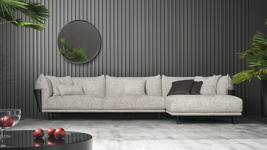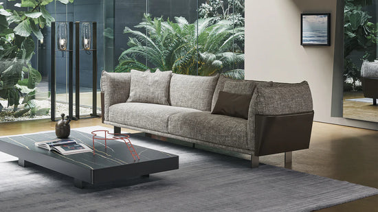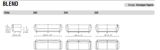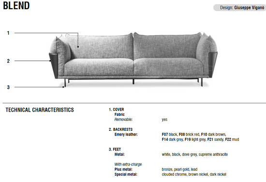 Canapeaua modernă și elegantă Blend se caracterizează prin atenția acordată detaliilor în prelucrarea materialelor sale compozite: piele șmirghel și țesătură. Liniaritatea structurii perimetrale acoperite cu piele smirghel echilibrează și adaugă un plus de valoare părții tapițate, creând o linie riguroasă care se lărgește în sus de la bază, îmbinându-se cu o curbă sinuoasă și primitoare care duce înapoi spre interior. Efectul de ansamblu este cel al unei soluții caracterizate printr-o imagine elegantă și un calm moale. Un element puternic, distinctiv, care poate fi apreciat din toate unghiurile, conferă acestei colecții rigoare și moliciune: structura din piele smirghel încadrează amortizarea și îi permite să se dezvolte vizual și mai mult.