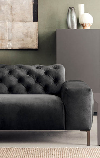 capac neted, detașabil sau, invers, cu manoperă capitonné, o tehnică fină realizată manual de maeștri tapițeri. Baza este alcătuită din picioare înalte din metal lustruit mat. Disponibil