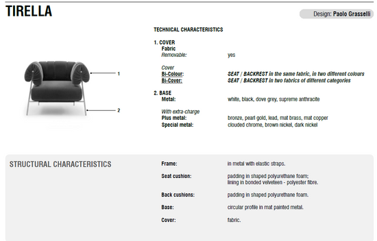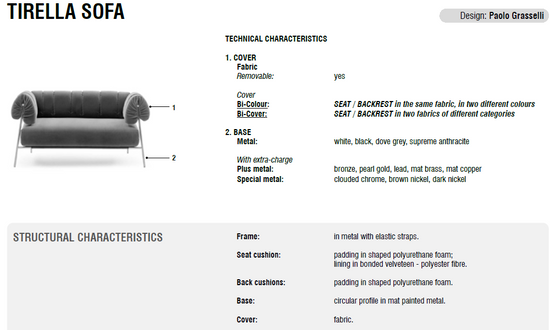 Canapeaua Tirella, o completare a colecției de fotolii, este un element cu gust retrò, inspirat de mostrele de țesătură care sunt așezate deasupra unei mese de tăiat. O mică canapea modernă cu o silueta sofisticată în care pernele, din simple „extra” preiau rolul principal, „îmbrățișând” cadrul metalic din jurul cotierelor și spătarului. Datorită dimensiunilor reduse, canapeaua Tirella este potrivită nu numai pentru spațiile de locuit, ci este perfectă și pentru mediile publice și zonele de recepție.