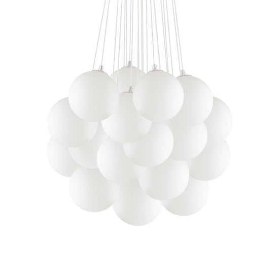 Cadru metalic alb. Difuzor sfera din sticla alba suflata si gravata. Cabluri din oțel cu lungime reglabilă.