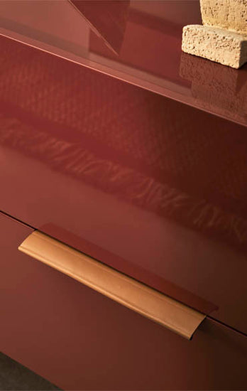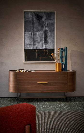 Comoda Dedalo cu Canaletto structura, fata si blat, titan mat bază, mâner din piele Hermes. Comoda cu Bosco mat structura si fronturi lacuite cu Blat Farinella terrazzo, plinta din titan mat, mâner din piele neagră.