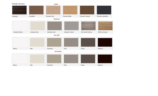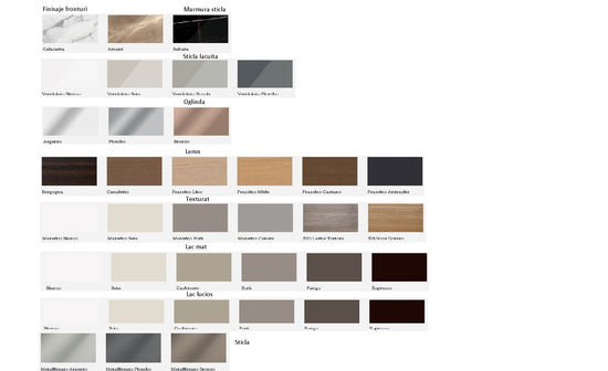 prin compoziţii simple sau complexe.Gama de finisaje disponibile este deosebit de largă pentru fronturi, care pot fi realizate din lemn, lăcuite, texturate, sticla sau oglinda. Deschidere push-pull sau cu mâner, in finisaje metalice, lacuite sau piele.