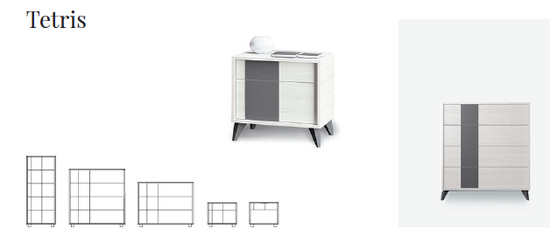 Linia TETRIS este disponibila cu 2 dimensiuni de comoda, o comoda si doua modele de noptiera (primul cu sertar si compartiment deschis, al doilea cu sertar si comoda)