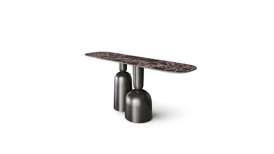 Partea superioară a consolei de poliție acționează ca o „oglindă magică”, reflectând și schimbând sensul lucrurilor. Flautul de șampanie arhetipal, răsturnat și mărit, definește designul bazei care constă din două socluri mari metalice. Vârful este un contrast, un element de geometrie pură care subliniază linia de demarcație cu lumea inversă imaginată de Roberto Paoli.