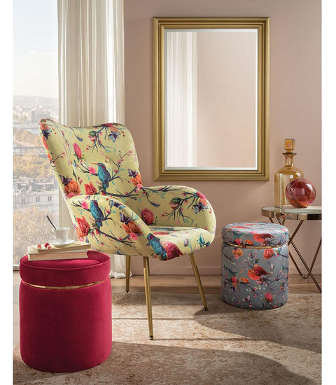 Fotoliu colorat cu un model floral rafinat. Elegant și rezistent datorită structurii din lemn și picioarelor din metal auriu. Perfect pentru a se combina cu pufurile noastre, pentru a crea un mediu cu un design boem.