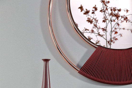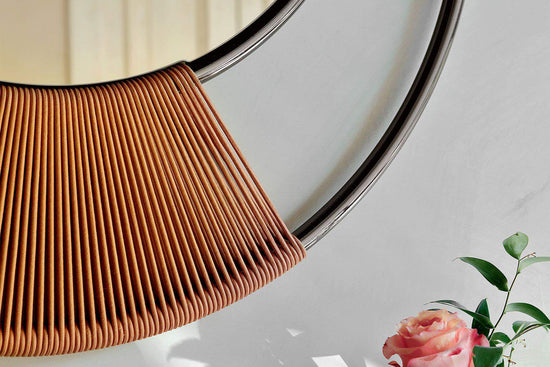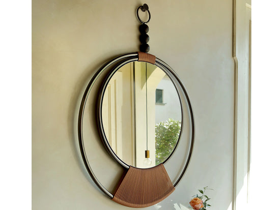Dreamy este o oglindă Tonin Casa cu o țesătură delicată țesută manual. Structura disponibilă în metal cromat sau roz are 3 sfere speciale din lemn masiv care o susțin. Oglinda este disponibila in 2 finisaje diferite: bronz sau argintiu.