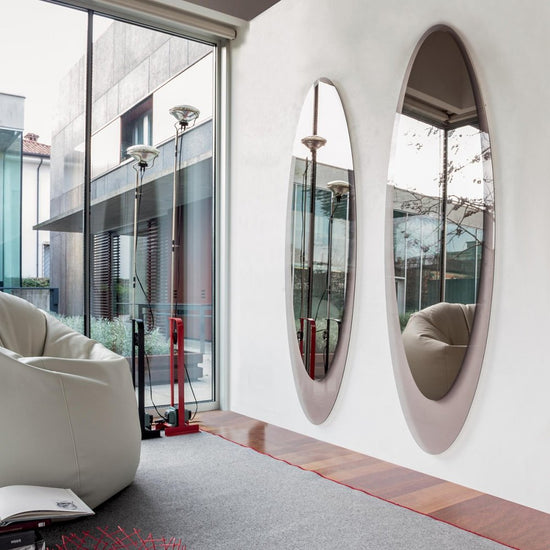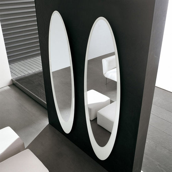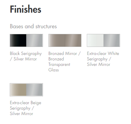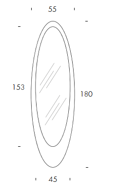 Oglinda Olmi amintește de o pereche de elipse, ușor lărgite în jos, care au ieșit una din cealaltă. Prima, baza, serigrafiata sau bronz in diverse finisaje, lasa loc in interior pentru oglinda adevarata, tot bronz sau argintie.