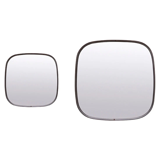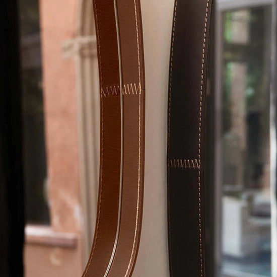 Oglindă în formă de tavite din piele groasă în finisaj maro închis sau coniac. Un design minimal și atemporal.