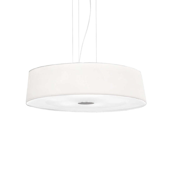 Cadru cromat. Abajur din folie PVC acoperit cu material textil. In partea de jos, difuzor din sticla transparenta sablata. Suspensii cu cabluri de lungime reglabila.