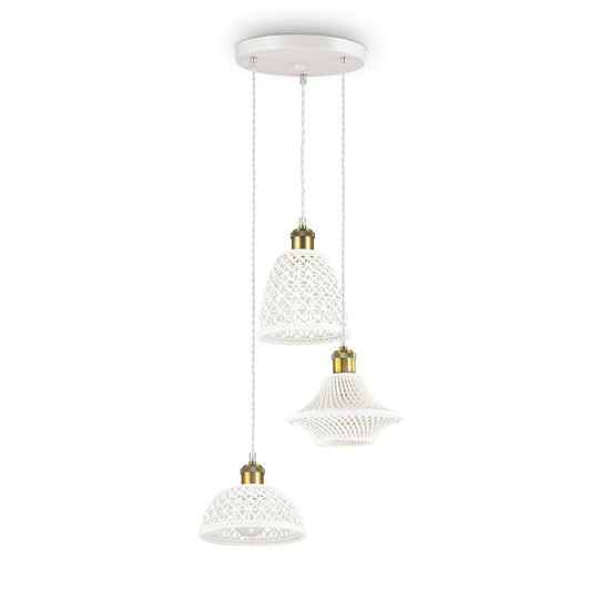 Rozetă din metal vopsit mat. Cablu din material textil cu suport de lampă din metal lustruit. Difuzor ceramic.