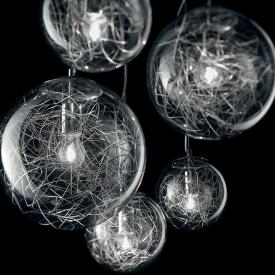 Cadru metalic cromat. Difuzor din sticlă suflată transparentă cu fir decorativ de aluminiu în interior. Lămpi cu suspensie cu cabluri de oțel reglabile în lungime cu dispozitiv automat.