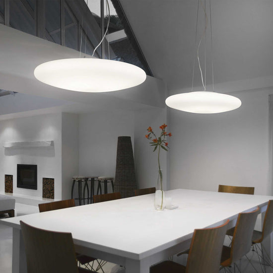 Cadru metalic vopsit alb. Difuzor din sticlă albă suflată. Cabluri de oțel cu lungime reglabilă cu dispozitive automate de oprire a cablurilor.