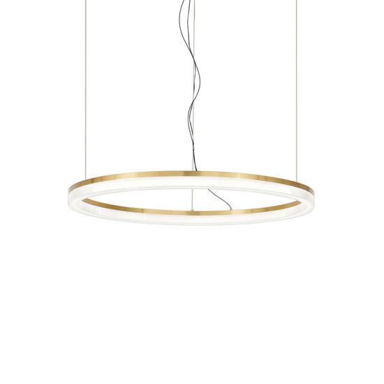 Prindere de tavan și cadru metalic cu finisaj din alamă periată. Cablu PVC negru. Difuzor acrilic opal cu element decorativ acrilic transparent cu efect de cristal taiat.