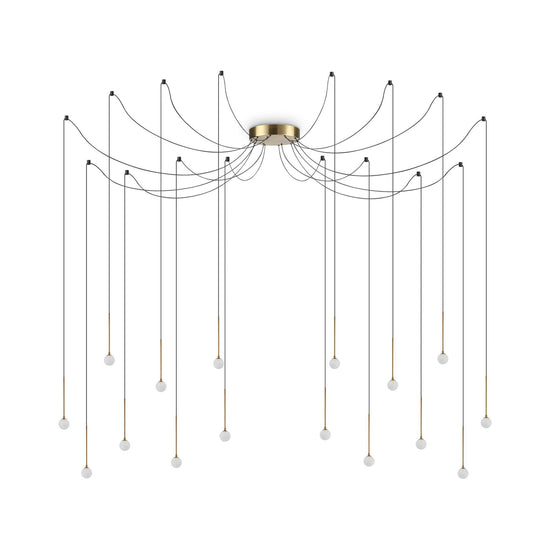 Prindere pe tavan metalica și corp suspendat vopsit cu pulbere sau placat. Difuzor sferic acrilic satinat. Cabluri PVC cu suport de tavan din aluminiu. Culori: alamă sau negru.