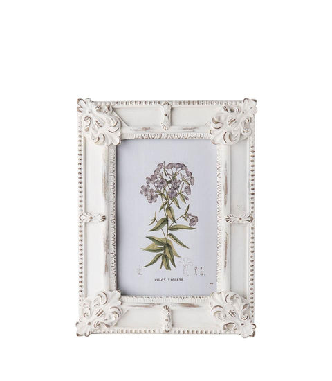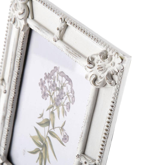 Rama foto dreptunghiulara din rasina alba pentru fotografii de 10x15 cm si de 13x18 cm. Efectul rafinat de lemn albit și broderii florale dau o notă eleganta decorului tău. Disponibil in doua dimensiuni.