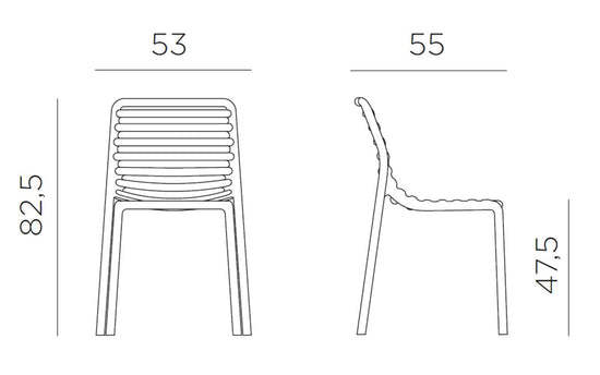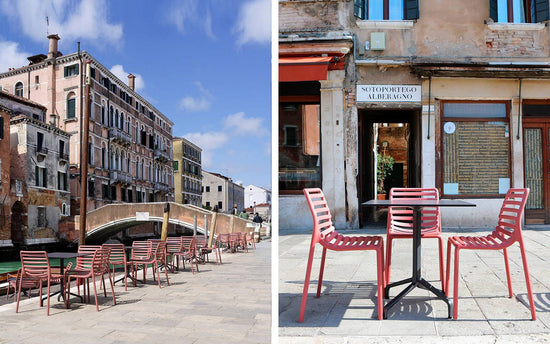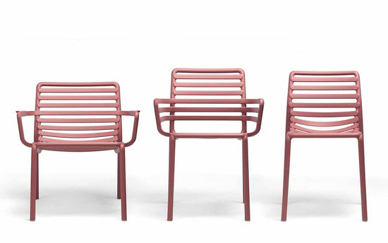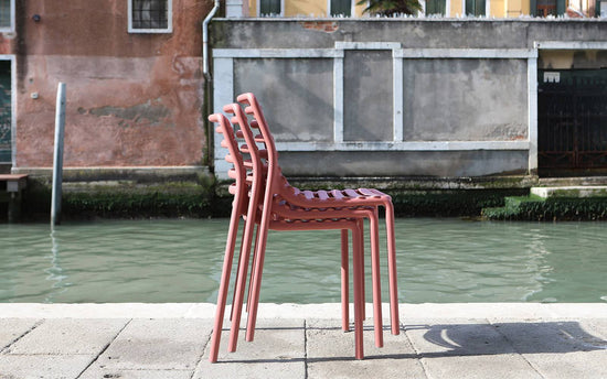 Designului cu șipci îi dă un aspect contemporan Doga Bistrot, un scaun de exterior fără cotiere din rășină din fibră de sticlă. Este la indemana de mutat, stivuibil, usor de igienizat si in intregime reciclabil.