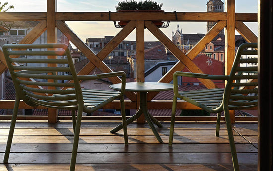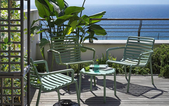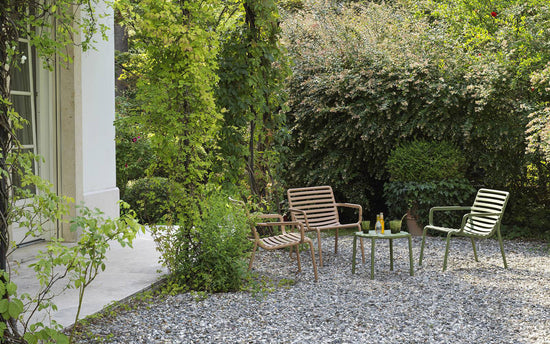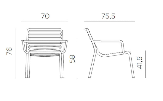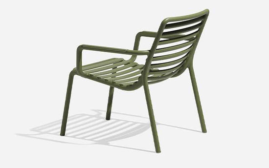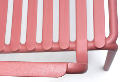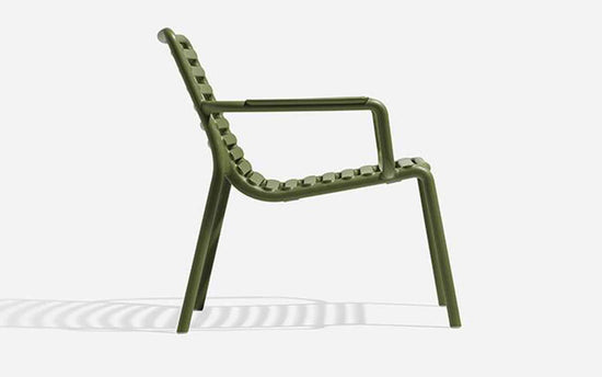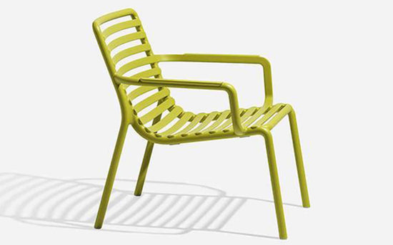 Un fotoliu relaxant, mare, joase pentru utilizare în aer liber, realizat din rășină din fibră de sticlă, care prezintă un joc de spații deschise și închise punctat de o succesiune de șipci orizontale. Stivuibil, ușor de igienizat și reciclabil.