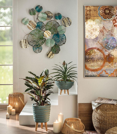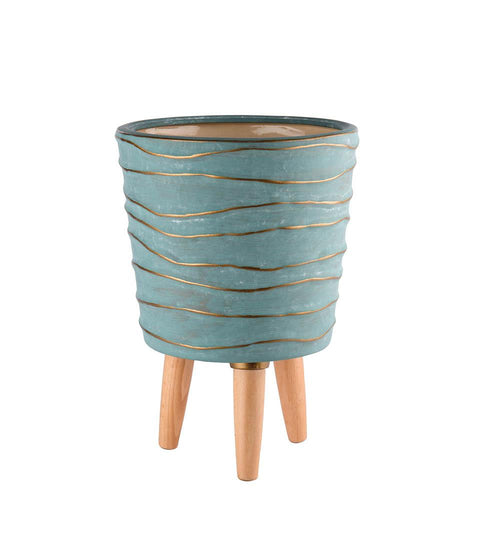 Suport turcoaz din ceramică cu picioare din lemn natural deschis. Eleganță cu o notă de culoare și detalii aurii închis pentru a oferi plantelor tale casa potrivită. Pentru a fi combinat cu suportul înalt pentru a crea un set de o eleganță extremă