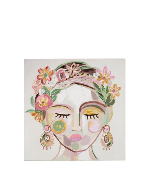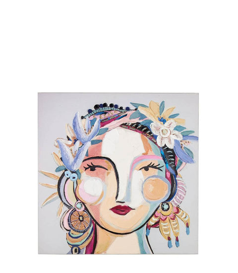 Tablou 80x80 cm, realizat cu tehnica serigrafiei pe panza cu aplicatii materiale. O fata delicata de femeie impodobita cu detalii rafinate. Un tablou care oferă camerelor tale o atmosferă fascinantă Etno Chic.