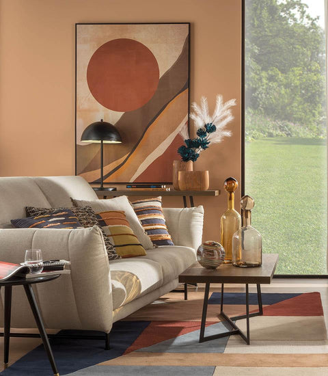 Tablou cu rama realizat cu tehnica serigrafiei pe panza. Un peisaj contemporan cu linii esențiale și stilizate. Culorile hotărâtoare și intense amintesc de nuanțele calde ale naturii. O piesă de mobilier care vă va face camerele elegante și primitoare.
