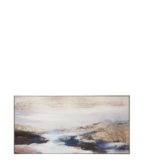 Tablou cu rama realizat cu tehnica de serigrafie pe panza cu aplicatii materiale. Un model inspirat din arta abstractă cu detalii materiale și elemente aurii prețioase care creează atmosfere magice de farmec mediteranean.