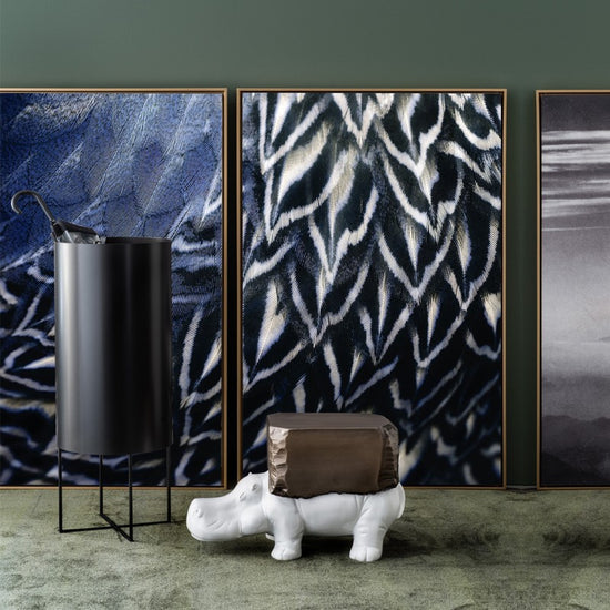 Set de 2 tablouri din material imprimat pe suprafata de ciment realizat manual. Rama este cu finisaj negru mat, negru auriu, auriu și cupru.