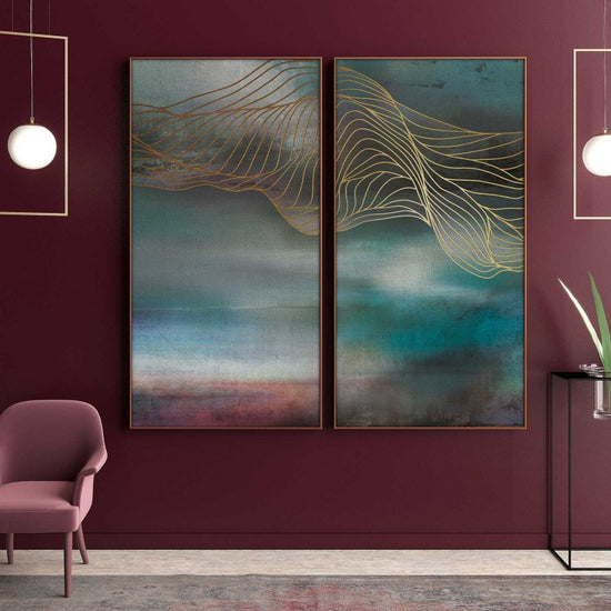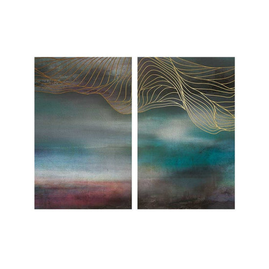 Set de 2 tablouri din material imprimat pe suprafata de ciment realizat manual. Rama cu finisaj negru mat, negru auriu, auriu și cupru. Subiectul esentei este întotdeauna împărțit în 2 părți.