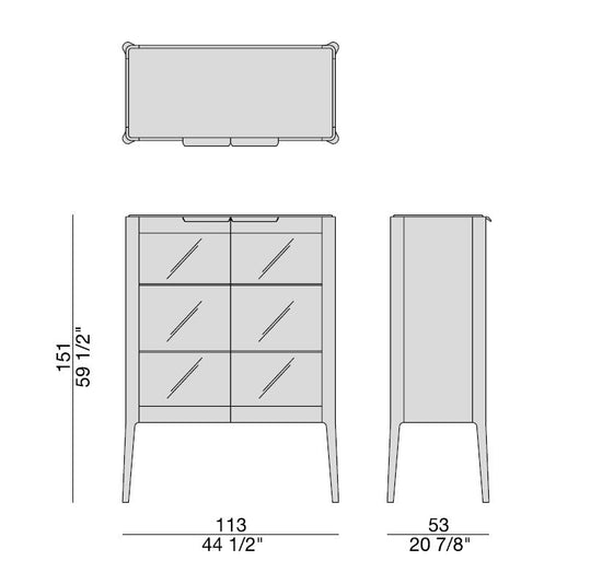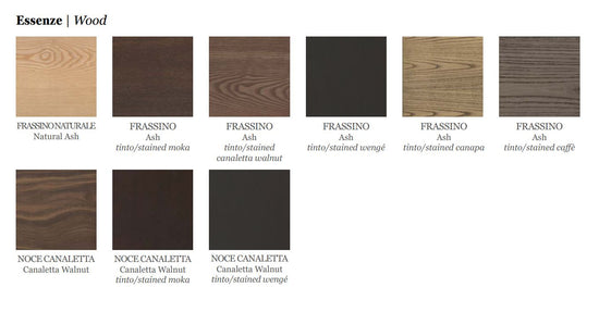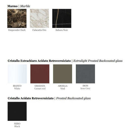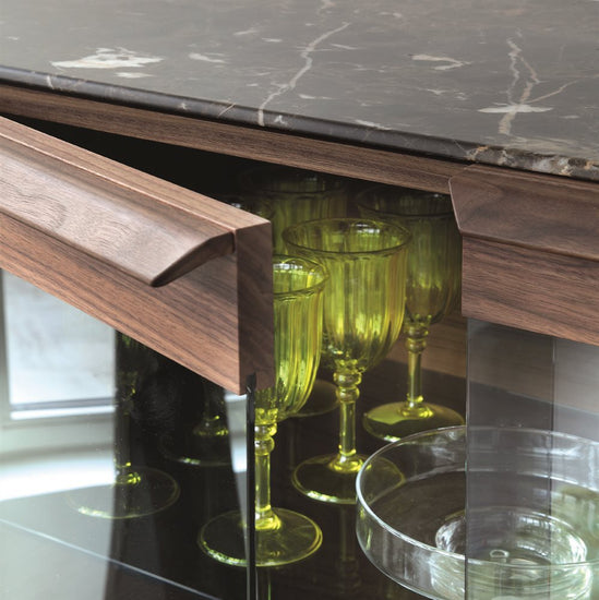 Vitrina din lemn de nuc cu două uși din sticlă afumată și blat din marmură, lemn sau sticlă acidulată vopsită. Rafturi interioare din sticlă.