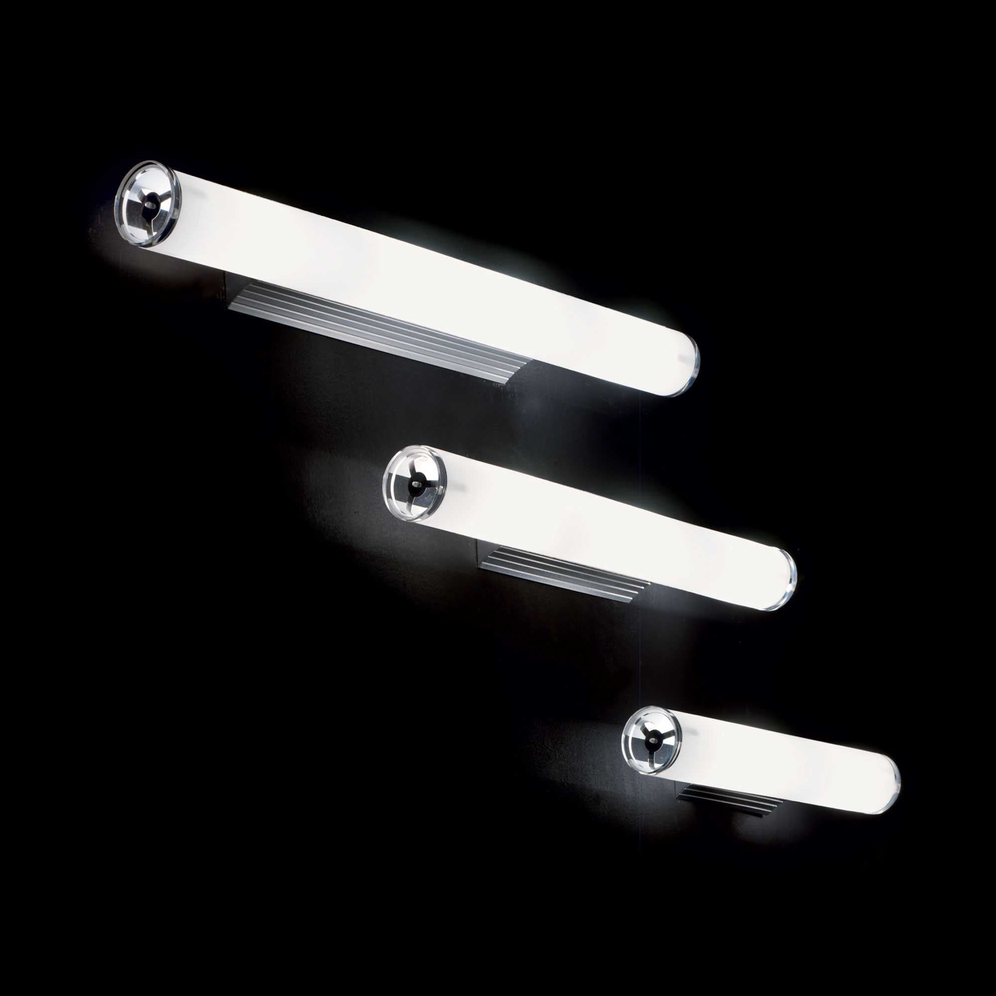 Baza din aluminiu. Difuzor din sticla alba suflata si gravata, inchis la capete prin discuri din material acrilic transparent.