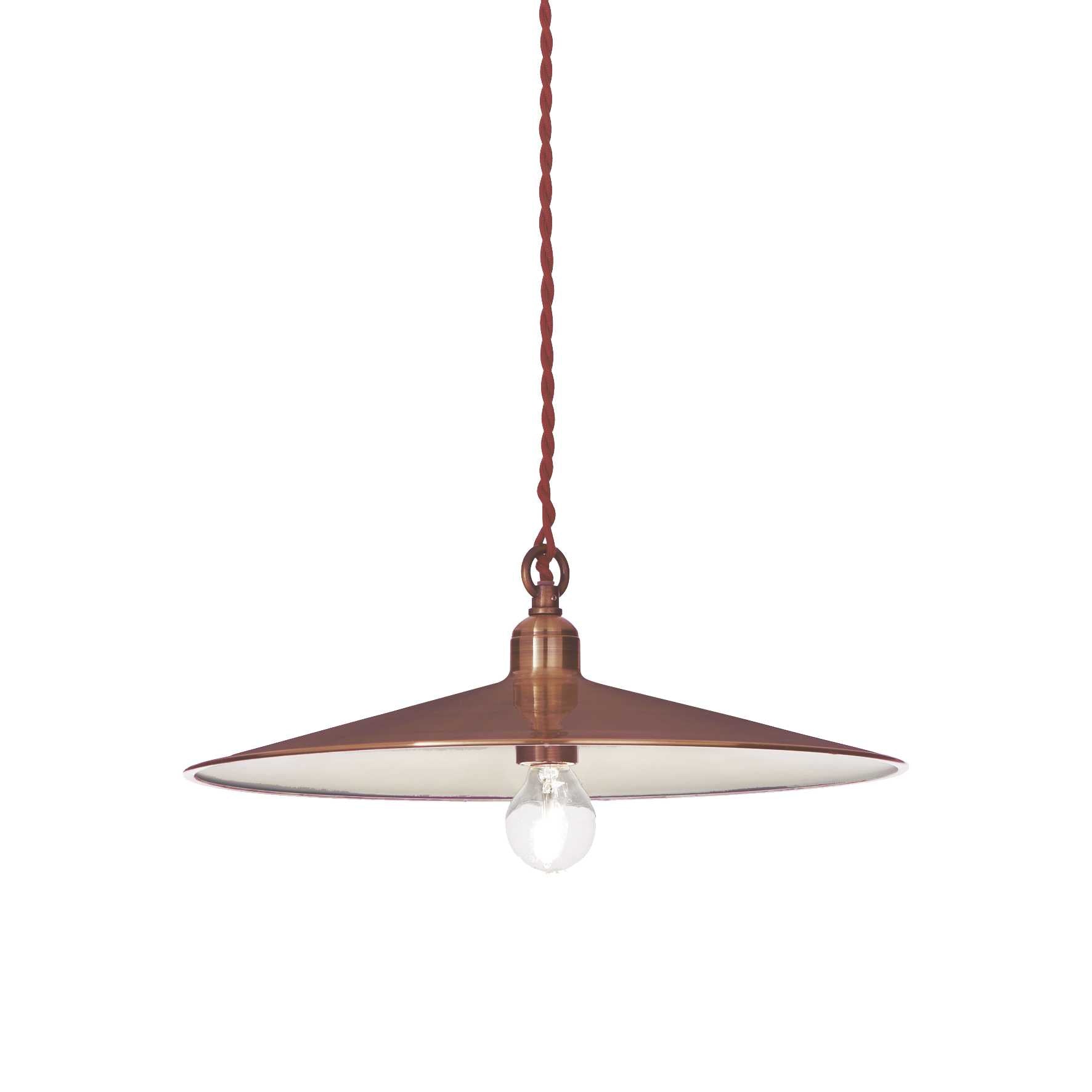 Cadru metalic, difuzor și capac suport de lampă disponibile cu finisaj lustruit sau cupru. Cablu electric imbracat in stofa si impletit.