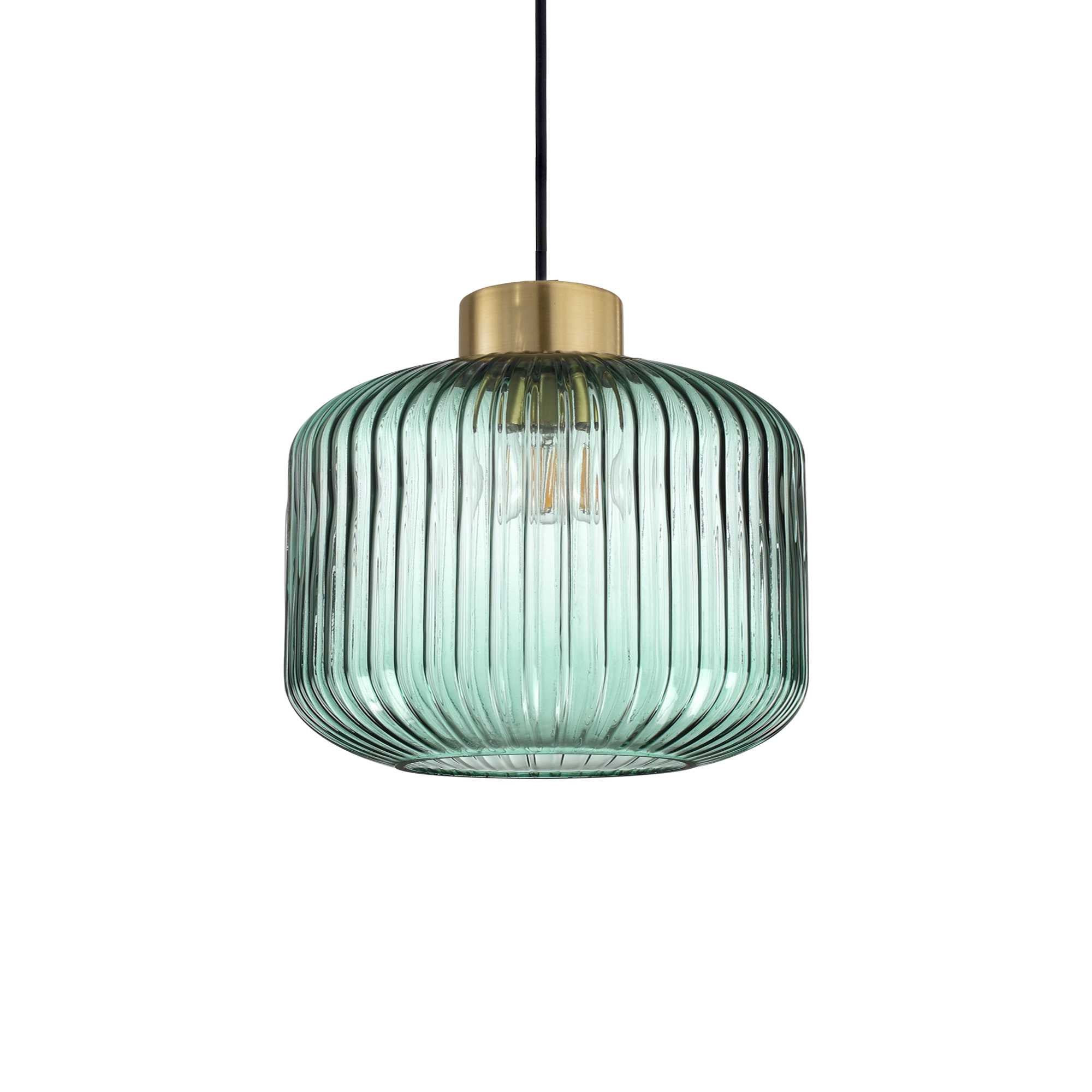 Cadru metalic cu finisaj alamă satinată și rozetă neagră mată. Cablu acoperit cu material textil. Difuzor din sticlă suflată cu caneluri ridicate. Disponibil în finisaje fum sau verde.
