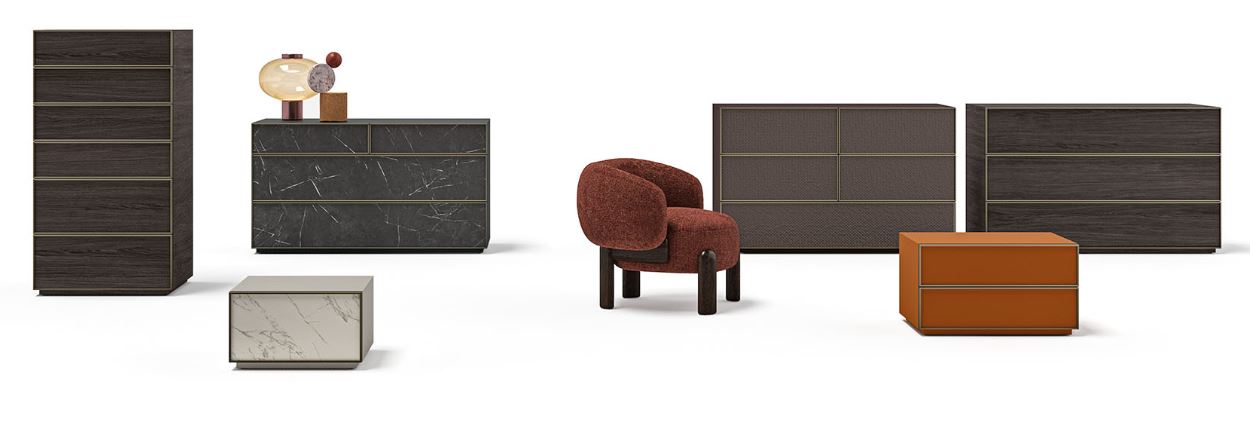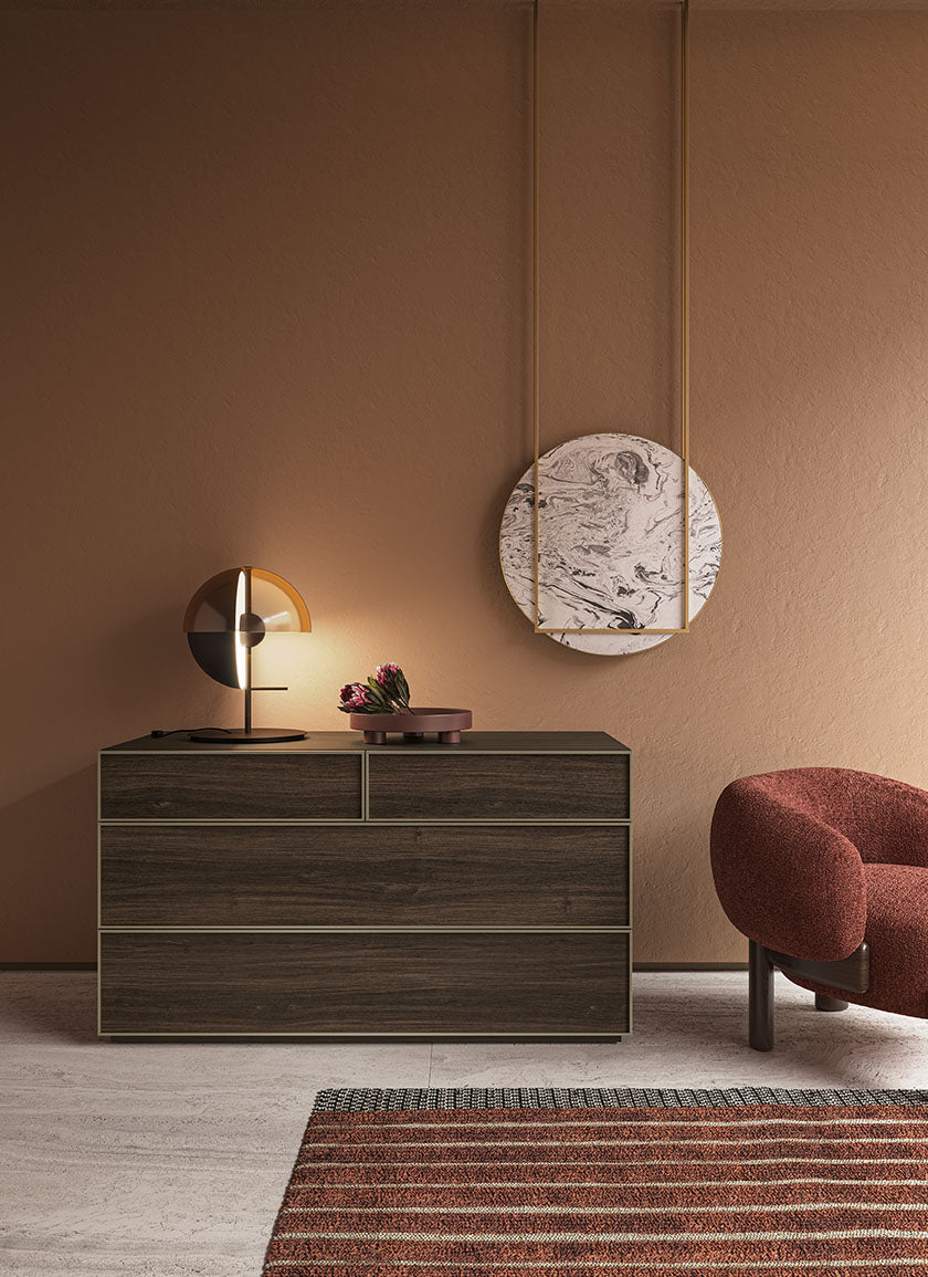 Fiecare noptiera Frame are o structură realizată din panouri aglomerate. Sertarele prezinta profile frontale din aluminiu.