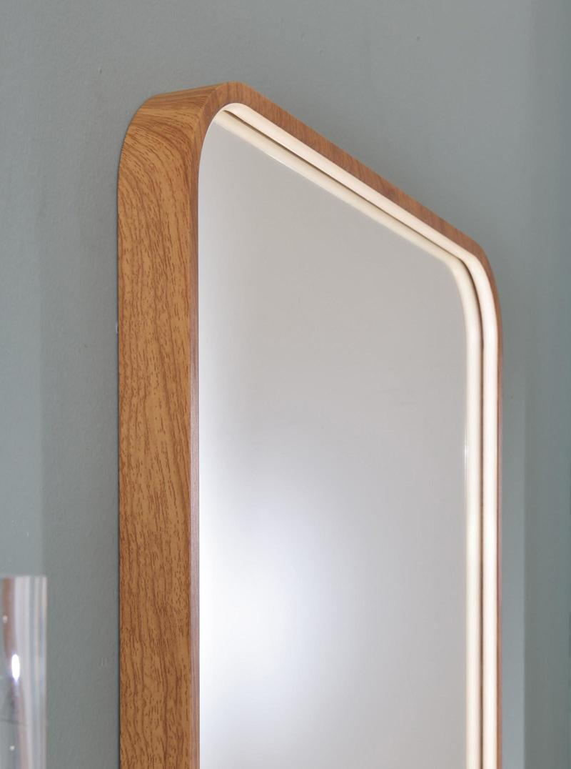 Oglinda de perete Ohm cu lumina led. Aprindere led cu buton tactil si reglarea intensitatii. Cadrul oglinzii este realizat din metal culoarea lemnului.