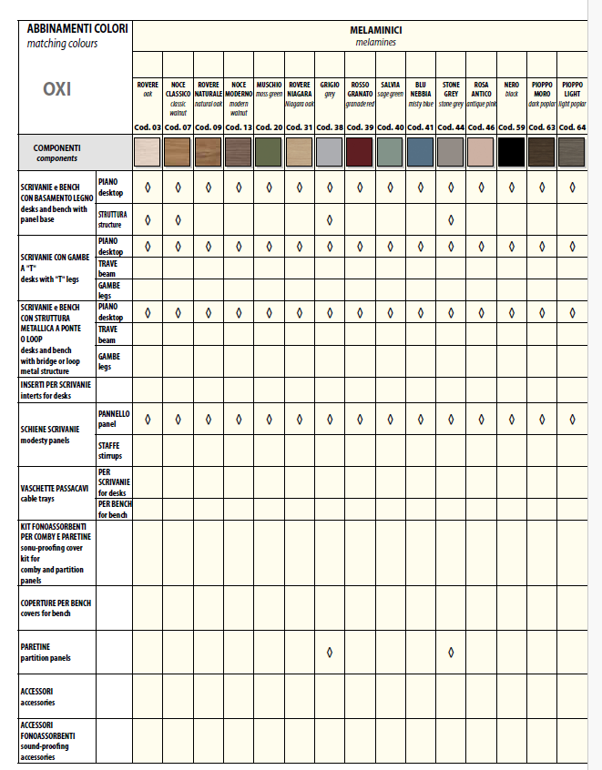 Oxi are picioare sobre și elegante. Datorită soluțiilor sale geometrice și tehnice, poate satisface orice necesități funcționale și de amenajare, potrivindu-se perfect în orice mediu cu numeroasele sale finisaje și accesorii.