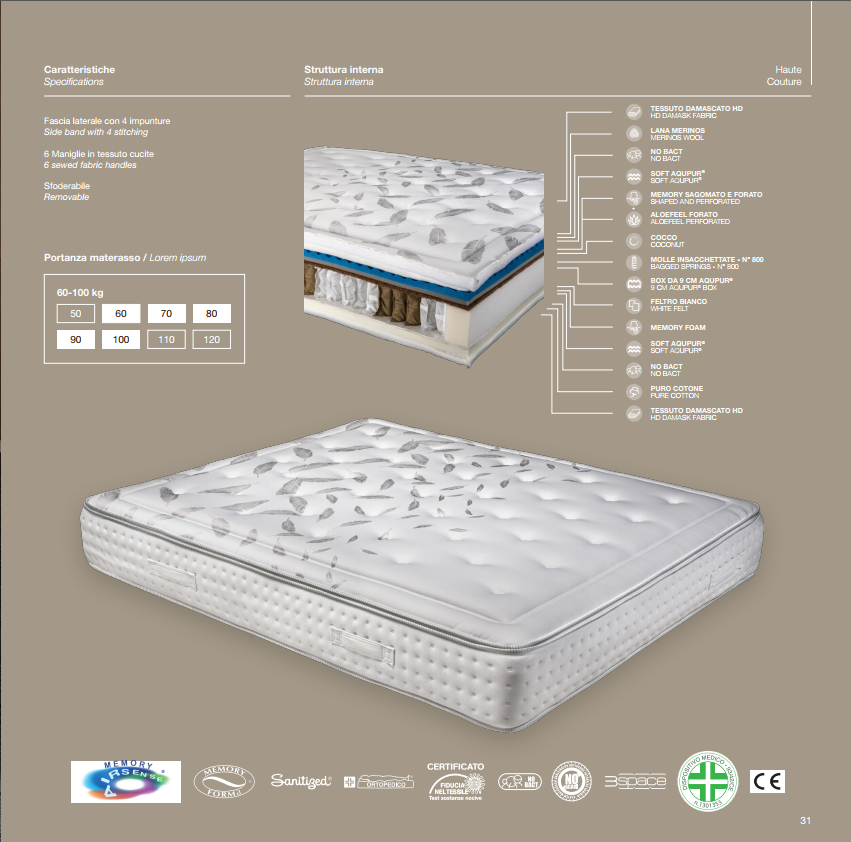 Manifatture dell'Adriatico oferă o gamă bogată de saltele duble cu arcuri buzunar de mare valoare, capabile să satisfacă nevoile de somn ale tuturor. Materialele de primă alegere, țesăturile extrem de rafinate și inovația tehnică caracterizează această saltea Luxor de la Manifatture dell'Adriatico și celelalte soluții ale sale. Daca esti in cautarea salteaua ideala care sa iti satisfaca nevoile legate de odihna, care iti garanteaza si o viata de zi cu zi linistita, atunci esti in locul potrivit. Expertiza considerabilă a mărcii îi permite să atingă excelență în ceea ce privește ergonomia și confortul cu produsele sale de calitate. Dintre saltelele cu arcuri impachetate pe care le poți vedea direct în magazin, fiecare va putea să-și aleagă pe cea ideală pentru sine, pentru a se bucura de cea mai bună odihnă.