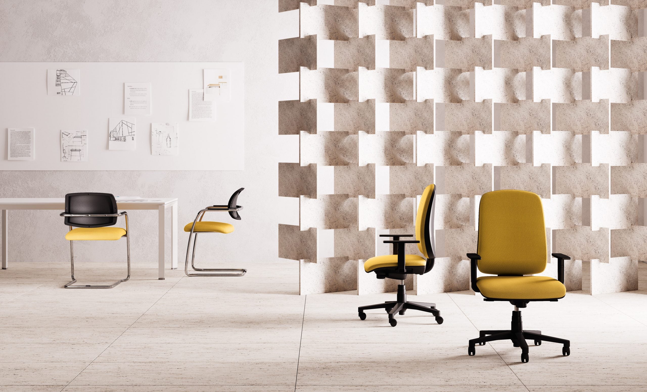Sistema garantează o mare continuitate stilistică între mașina de scris și scaunele cantilever, oferind combinații potrivite și bine echilibrate în orice mediu de lucru.