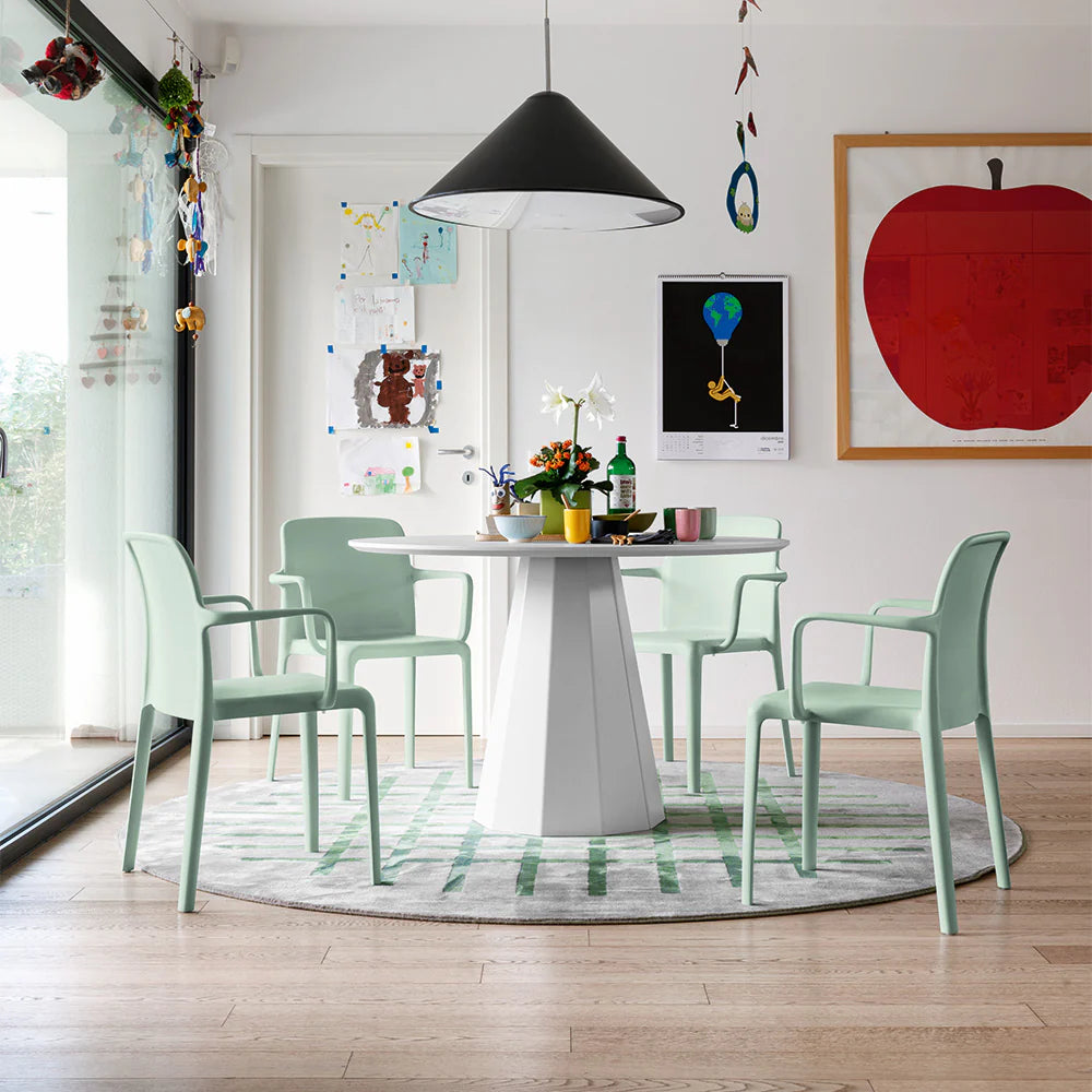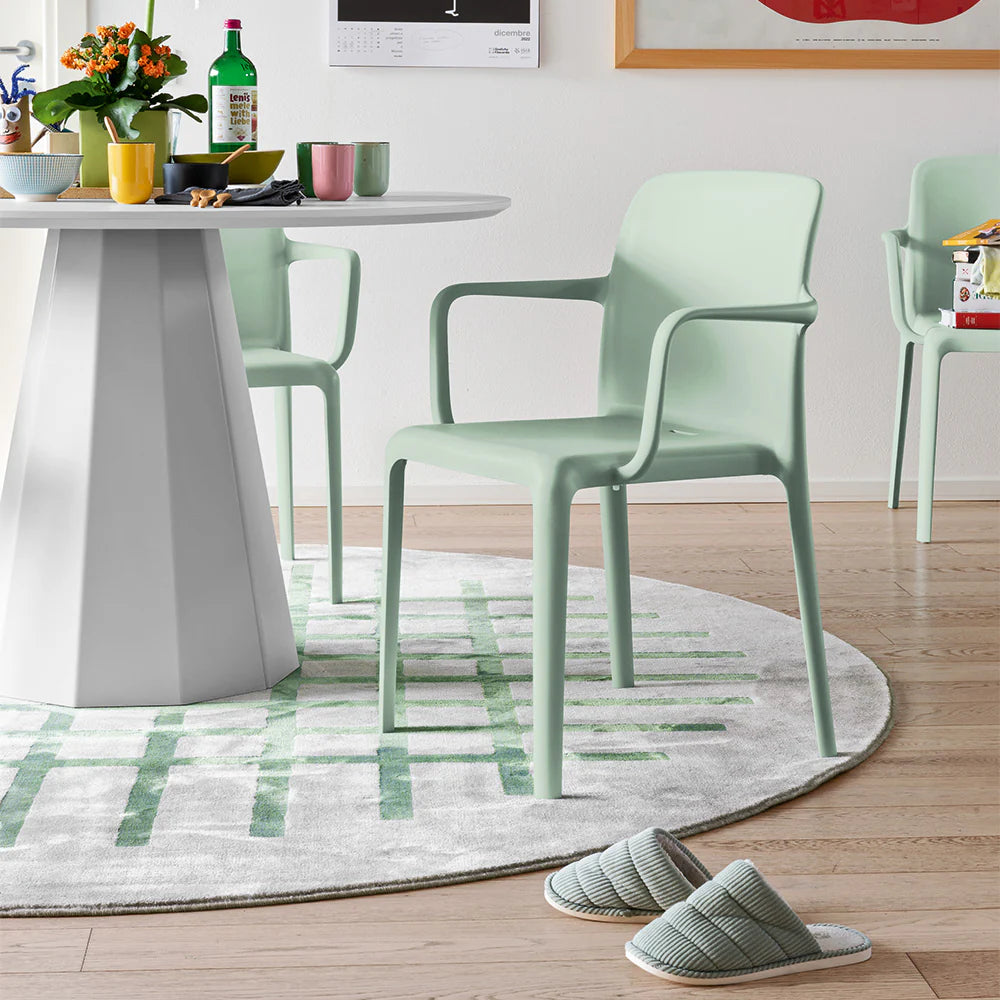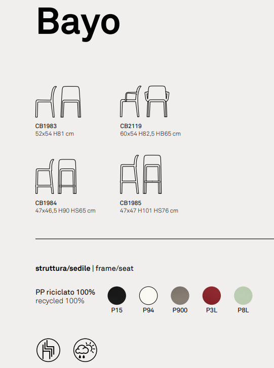 Scaun monobloc BAYO din polipropilenă, fabricat prin tehnologia de turnare cu aer, care oferă ușurință și robustețe în același timp. Silueta sa îndrăzneață și marginile rotunjite creează un contrast atractiv și scot în evidență frumusețea spătarului ușor conic. Potrivit atât pentru acasă, cât și pentru utilizarea în sectorul contract. Perfect și pentru exterior, scaunele Bayo sunt stivuibile până la 6 înălțimi. Picioare interschimbabile.