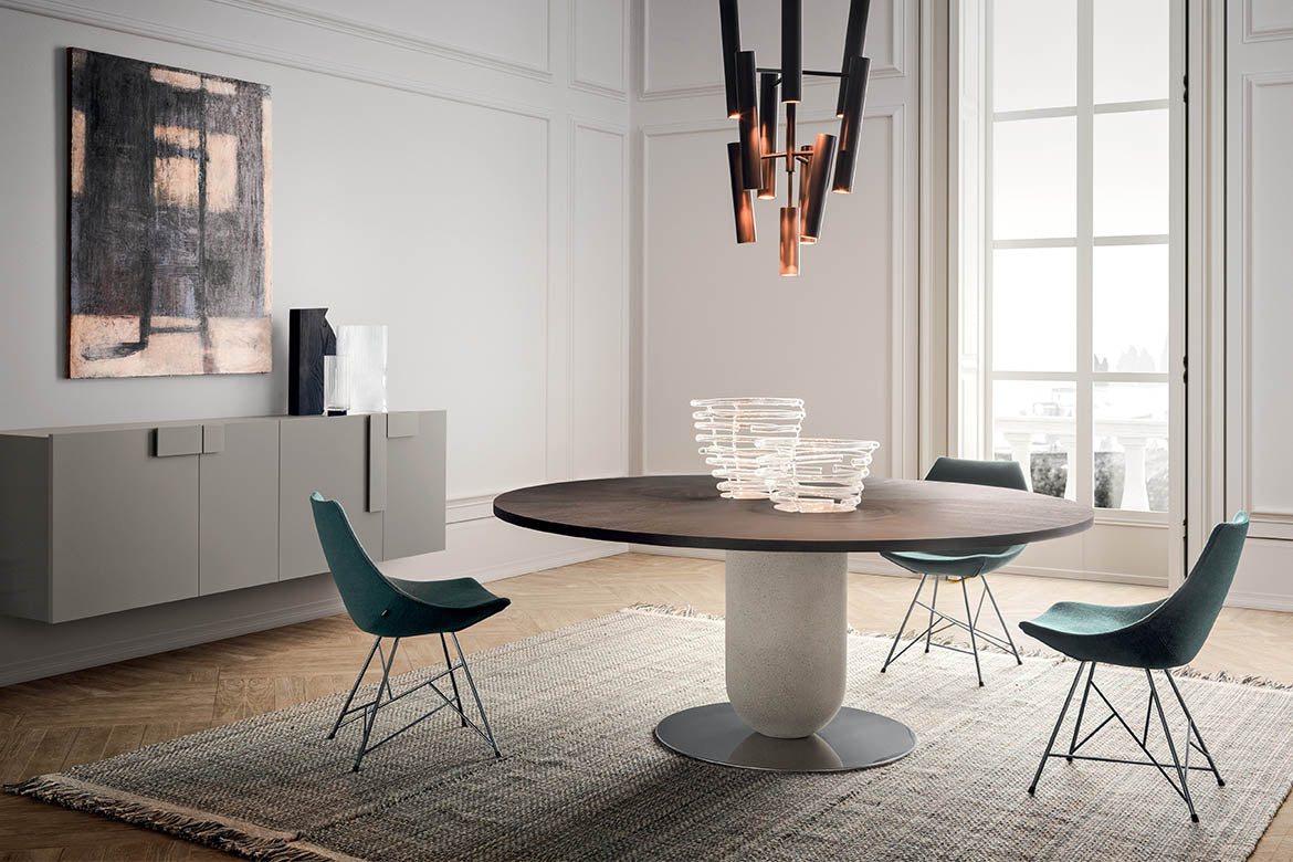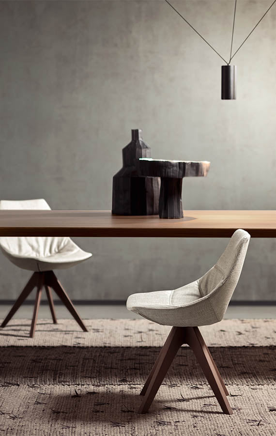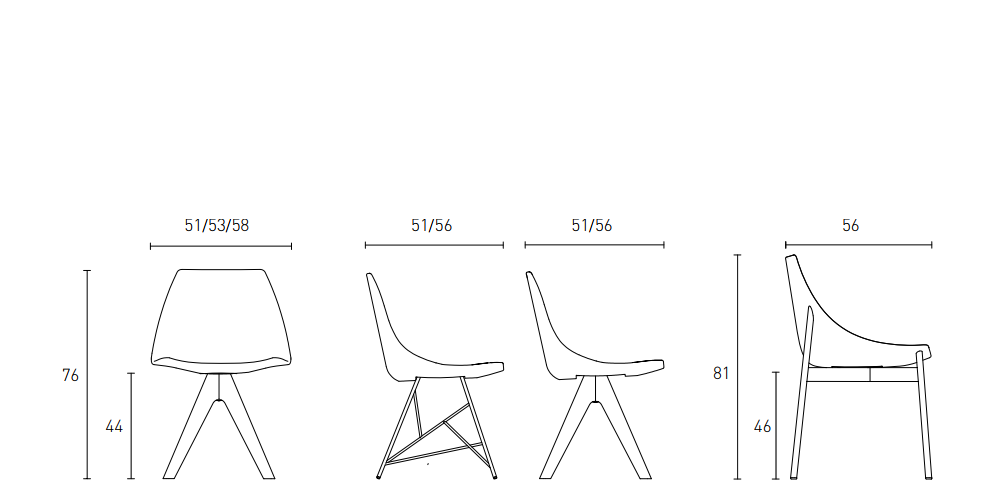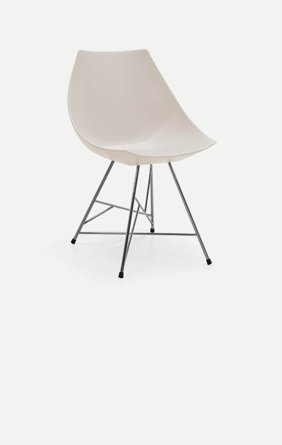 Liniile întrerupte și culorile vii îmbogățesc diferențele dintre baze, care sunt ușoare și stabile. Caracteristica semnăturii este șezutul său: forma, care amintește de secțiunea transversală a unui ou, este concepută pentru a fi confortabilă și încântătoare, atât în varianta rigidă lăcuită, cât și în versiunea căptușită, cu huse nedetașabile sau libere, disponibile în material textil, piele și piele sintetică. Baza este variabilă și vine în trei versiuni: stâlp metalic, picioare înclinate din lemn masiv și bază tubulară.