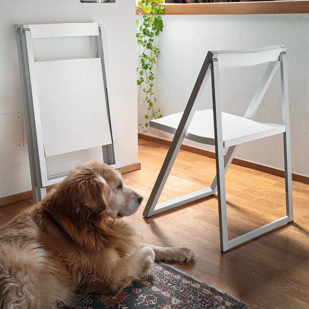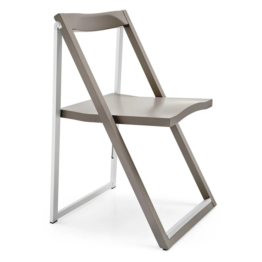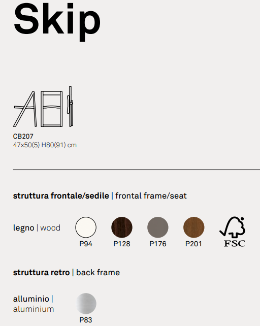 Scaun pliant model SKIP: practic și ușor, cu un design minimalist și o structură din lemn și aluminiu. Designul unic al acestui scaun se naște din combinarea părții frontale din lemn masiv de fag și a părții posterioare din aluminiu. Când este pliat, este foarte compact și poate fi ușor agățat pe cârligul FLAT montat pe perete. Versatil, potrivit pentru bucătărie și spații mici, este soluția ideală pentru a așeza rapid oaspeții. Alegeți combinația preferată.