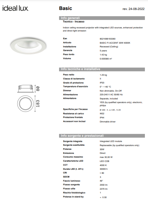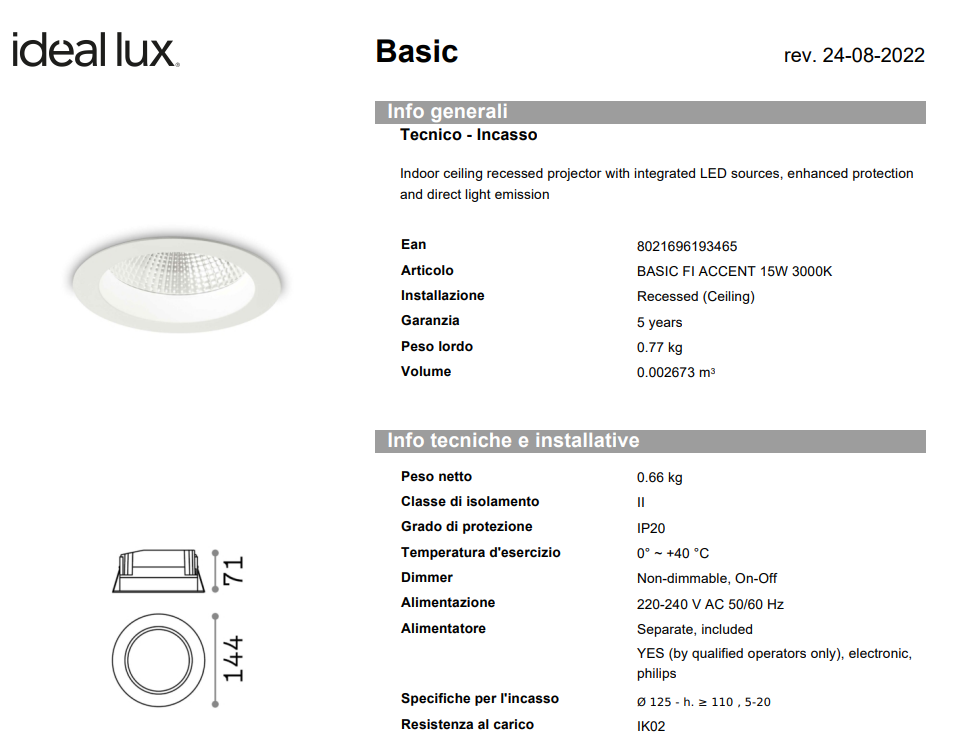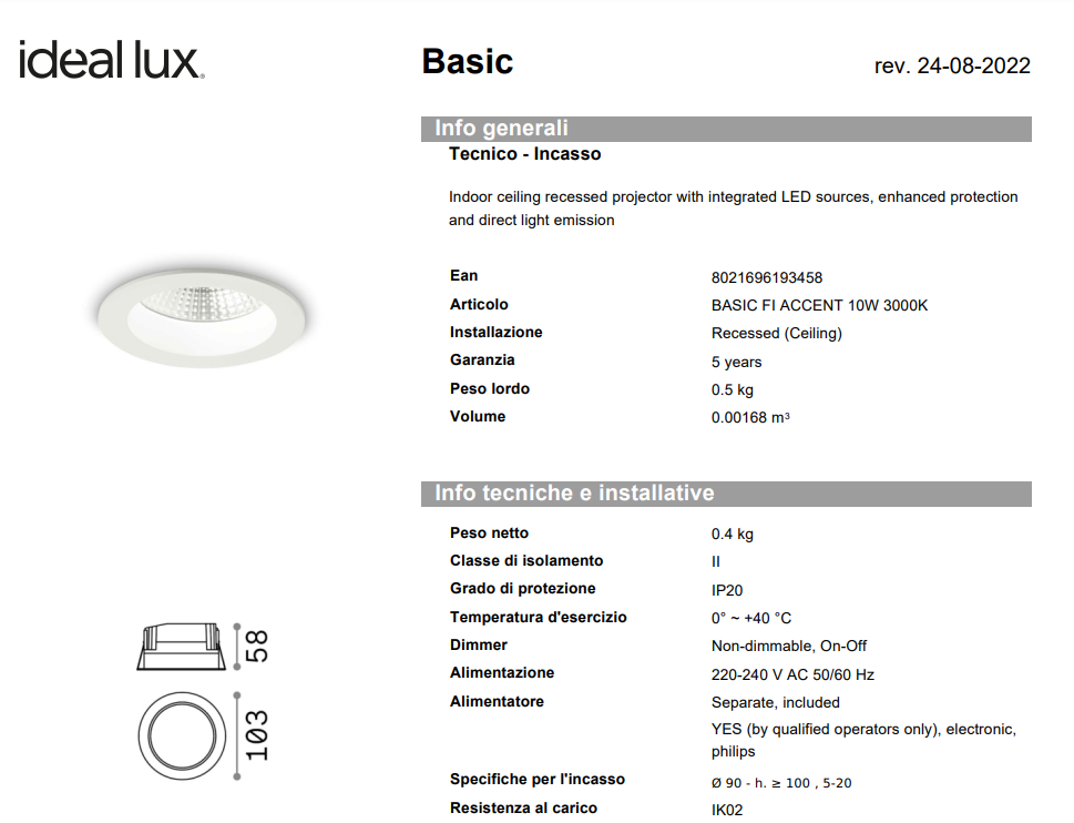 Spot încastrat din aluminiu turnat sub presiune cu manșon rotund, potrivit pentru instalare pe tavane din gips-carton. Finisaj alb mat. COB Chip on Board și tehnologie SMD. Protecție frontală IP44 (cu produsul instalat).