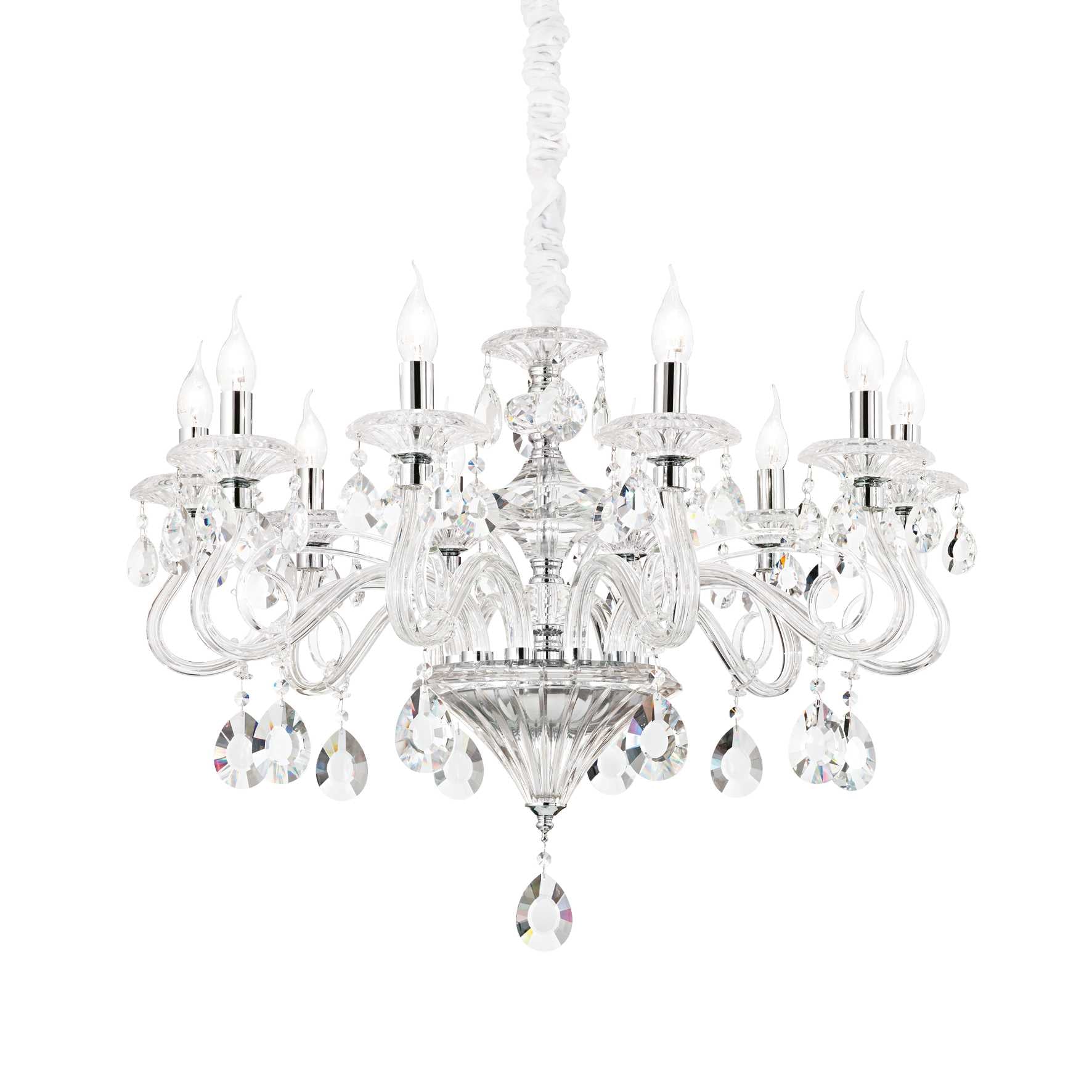 Cadru metalic cu finisaj cromat sau auriu. Brațe din sticlă suflată transparentă cu interior auriu în varianta aurie. Central compus din blocuri de cristal taiat. Elemente decorative din sticla transparenta si cristal taiat.