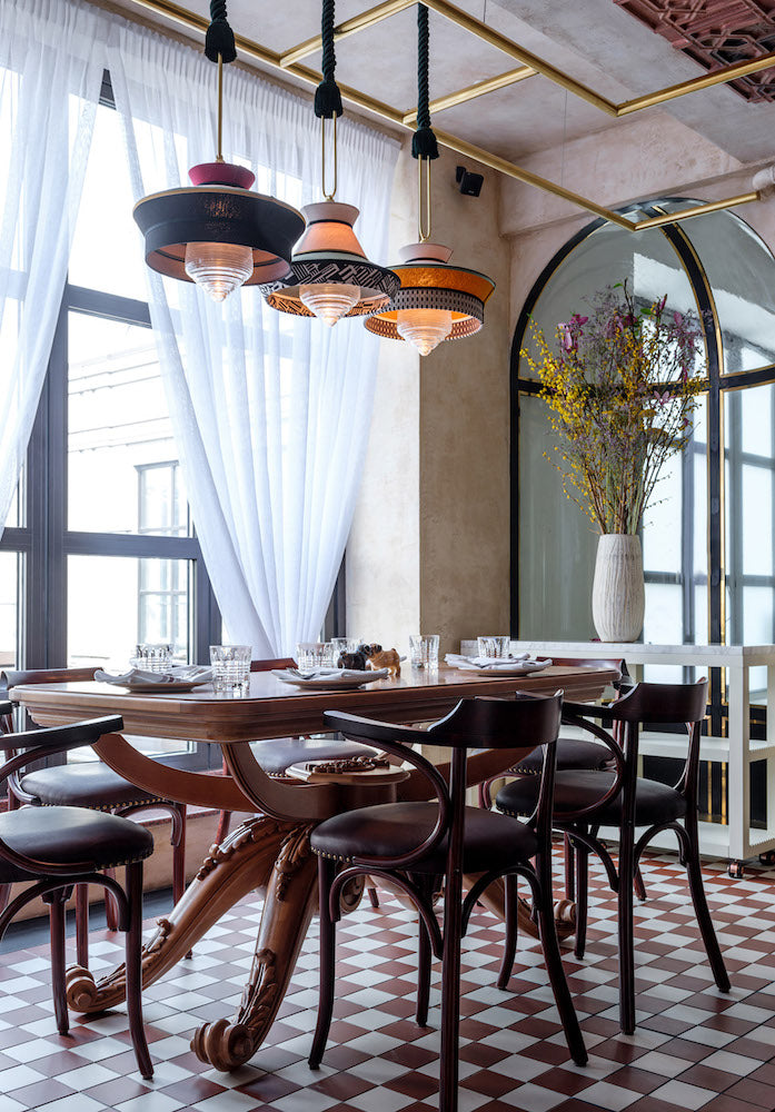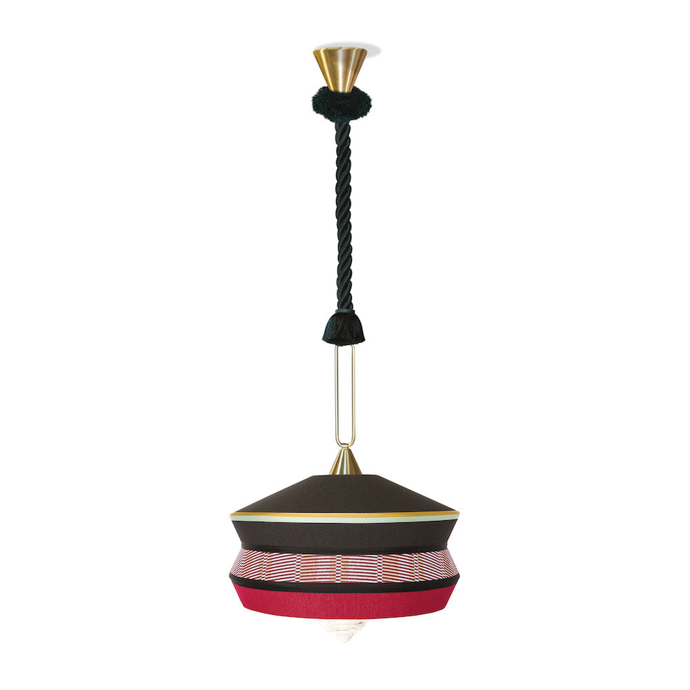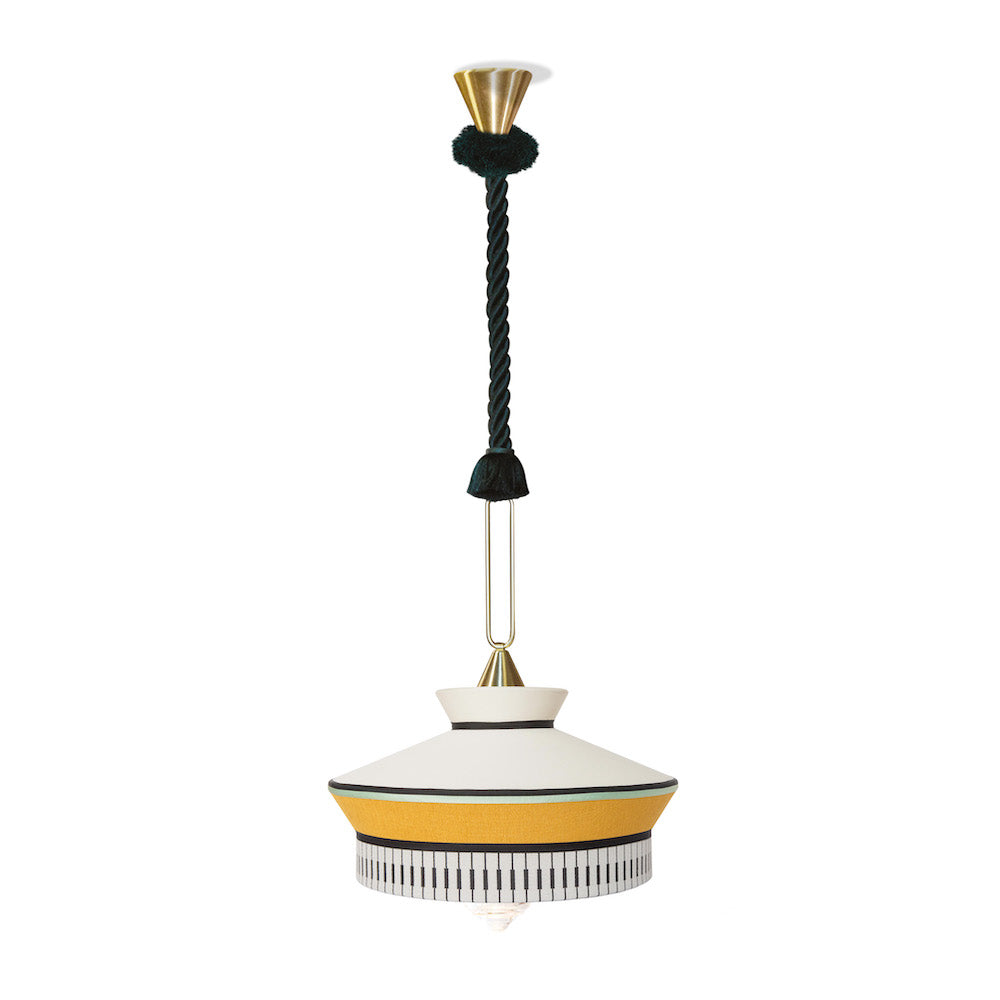 Calypso este o colecție de lămpi cu suspensie inspirată din perioada art deco, cu țesături ale căror texturi și modele geometrice alb-negru amestecate cu culori strălucitoare inspirate din cultura sud-americană și tropicală, dezvăluie un rezultat foarte original. Versiunea de interior se caracterizează printr-un cordon de mătase țesut verde. Suportul este un inel din alamă satinată. Difuzorul este din sticla transparenta.