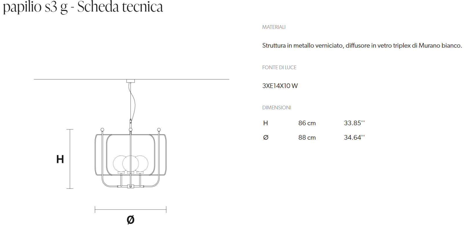 Papilio este o colecție inspirată dintr-o specie rară de fluture, Papilio machaon Linnaeus. Structura din metal vopsit ,Difuzor din sticla triplex de Murano.