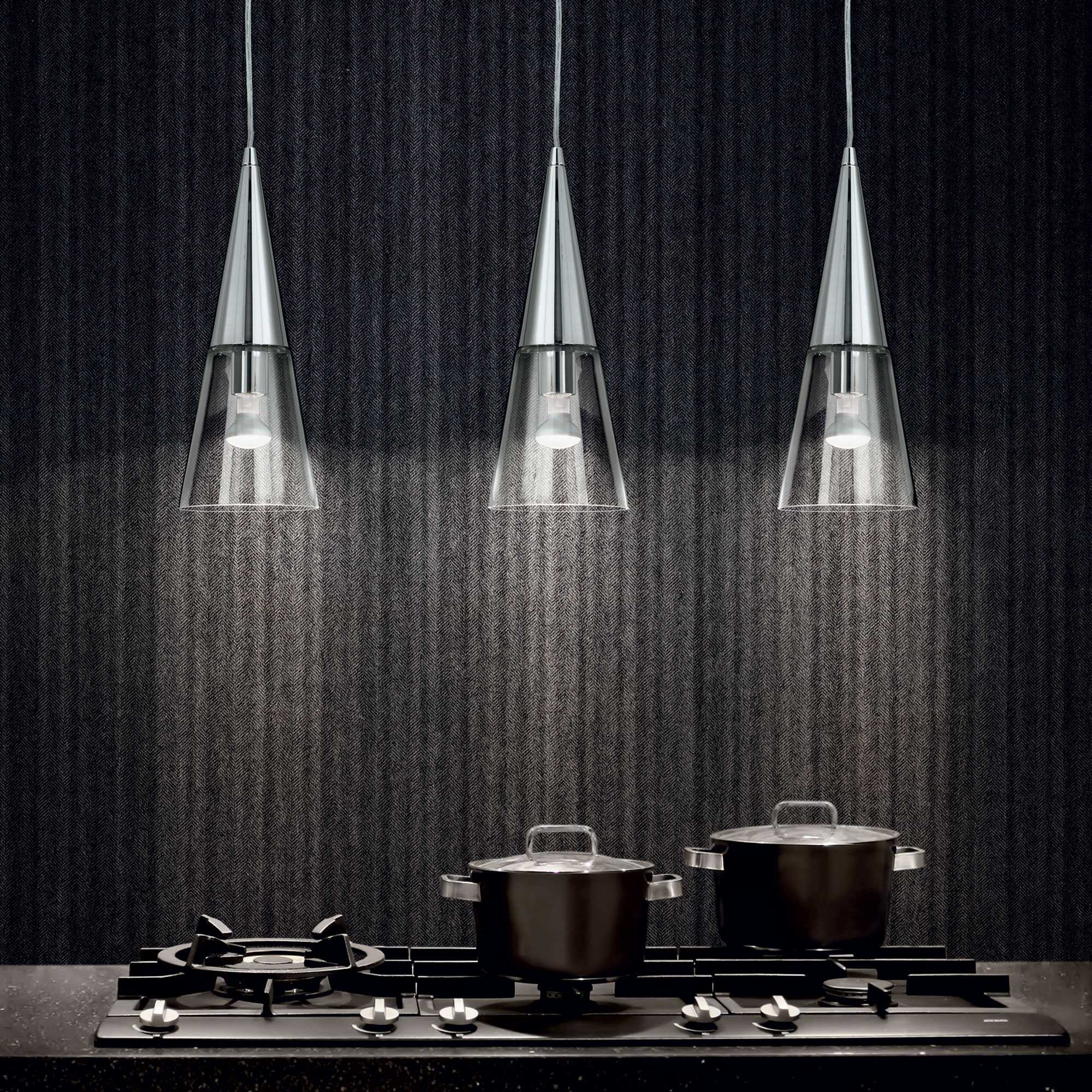 Pendul suspendat metalic cromat și soclu pentru lămpi. Difuzor din sticla suflata manual. Versiune cromată cu sticlă total transparentă.