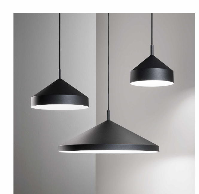 Cadru și abajur din metal vopsit cu pulbere. cablu PVC. Culori: alb total sau negru cu interior alb.