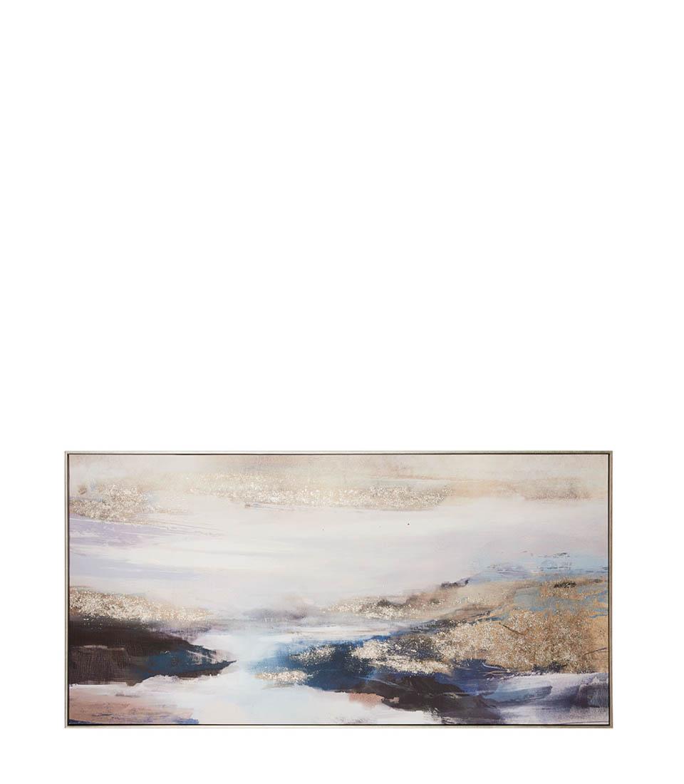 Tablou cu rama realizat cu tehnica de serigrafie pe panza cu aplicatii materiale. Un model inspirat din arta abstractă cu detalii materiale și elemente aurii prețioase care creează atmosfere magice de farmec mediteranean.