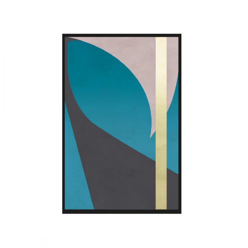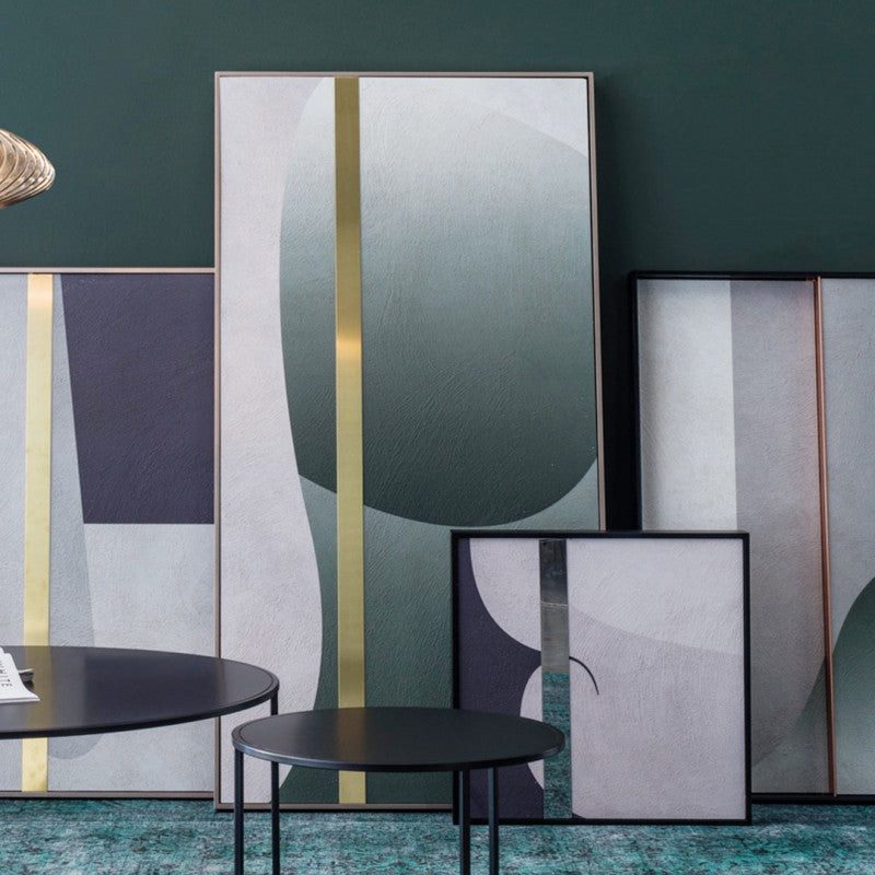 Tablou texturat cu finisaj de ciment și bandă decorativă de 4 cm lățime din oțel inoxidabil sau alamă. Cadru grosime de 6 cm cu finisaj lacuit negru mat pentru profilul din otel inoxidabil si negru auriu pentru profilul din alama.