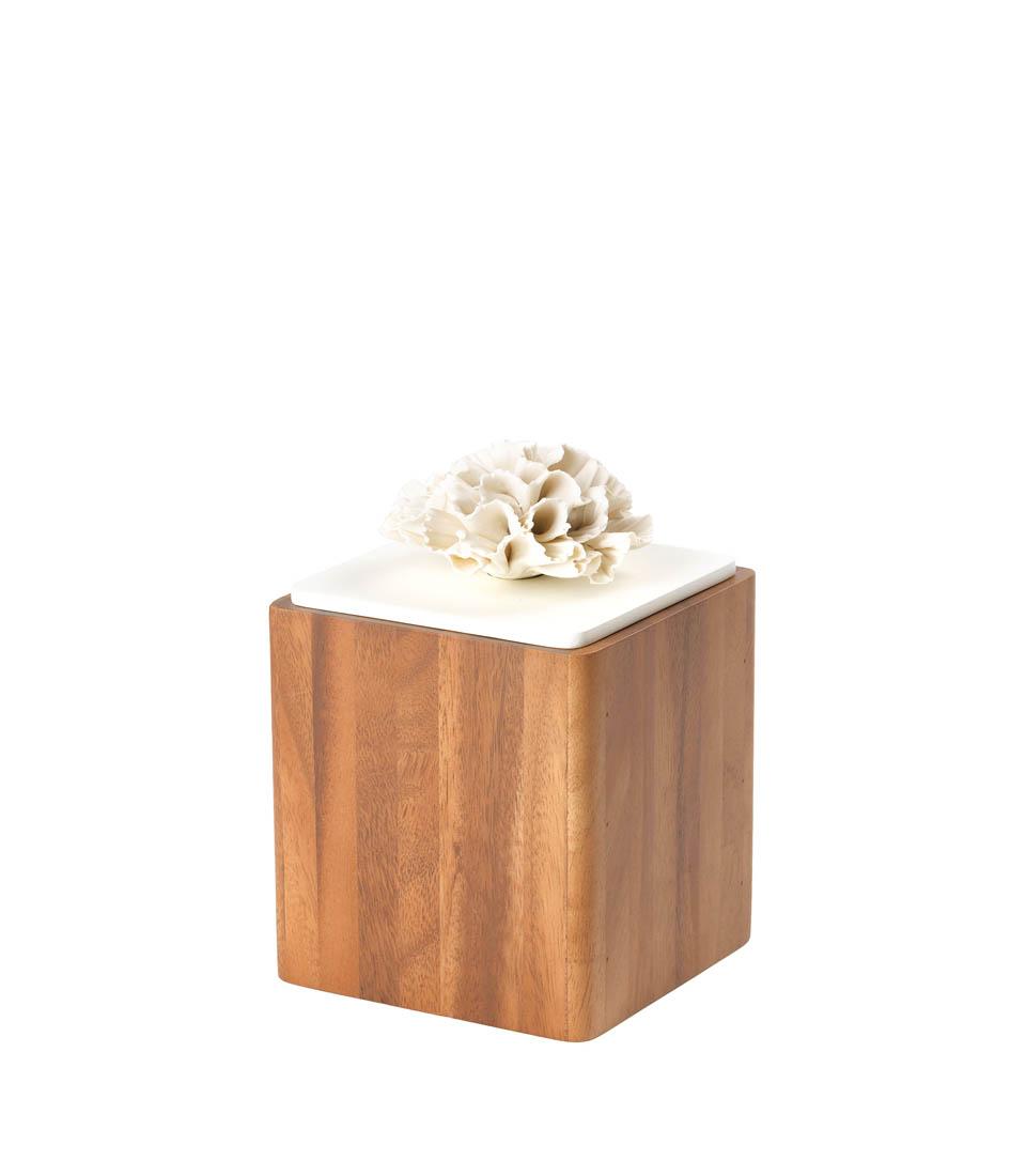 Borcan pătrat din lemn cu capac din porțelan. Aceasta cutie este accesoriul ideal pentru un mediu de design modern, caruia ii va da o nota calda si perfect naturala.